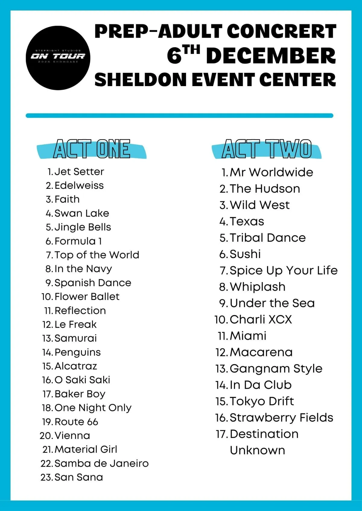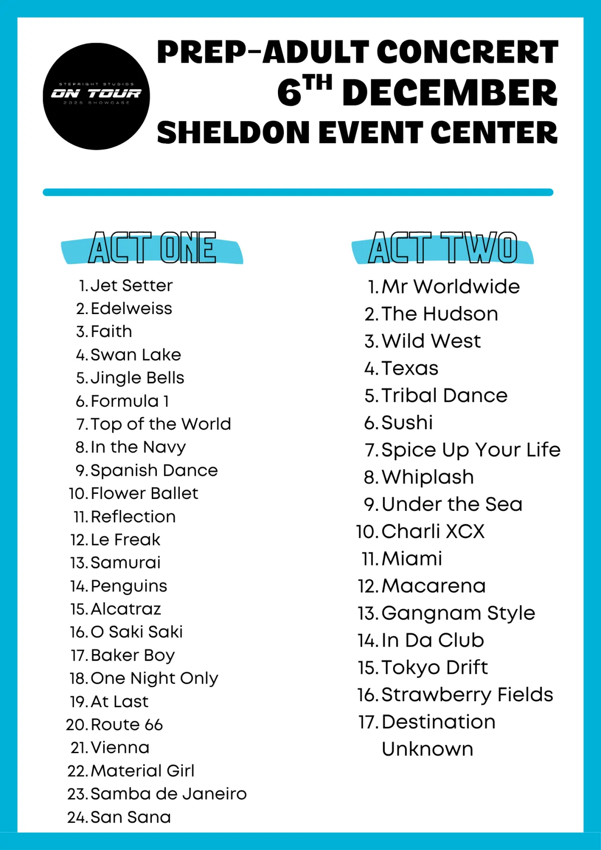 Arrive with hair and makeup done, stockings and required dance underwear on, and wearing concert T-shirt with your choice of black bottoms.